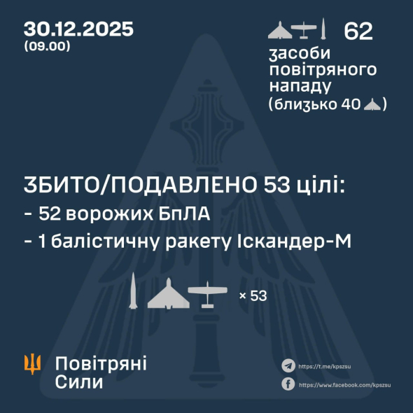 У ніч проти 30 грудня противник атакував двома балістичними ракетами “Іскандер-М”, а також 60...